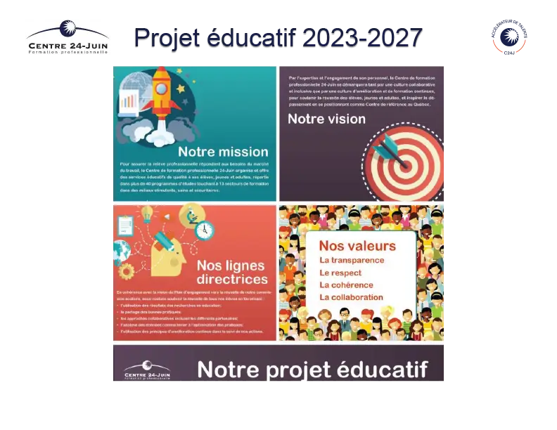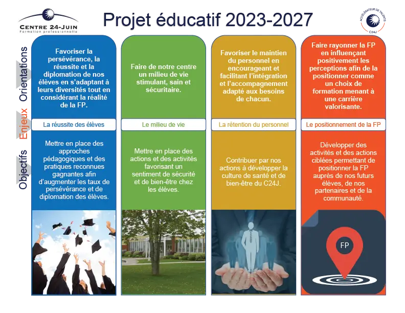 Le projet éducatif est un outil stratégique présentant les orientations, les priorités d’action et les résultats attendus pour assurer la réussite éducative de tous les élèves, jeunes et adultes. Il est élaboré et actualisé à chaque année par toutes les équipes du centre de formation professionnelle 24-Juin.
