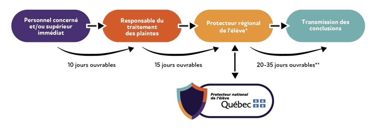 - Il est d’avis que le respect de ces étapes n’est pas susceptible de corriger adéquatement la situation ou que le délai de traitement de la plainte aux étapes précédentes rend l’intervention du protecteur régional de l’élève inutile;
