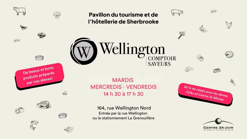Wellington, comptoir saveurs est un comptoir de vente pour les produits préparés par les élèves des programmes de boucherie, de cuisine et de pâtisserie du Pavillon du tourisme et de l’hôtellerie de Sherbrooke du Centre de formation professionnelle du 24-Juin.